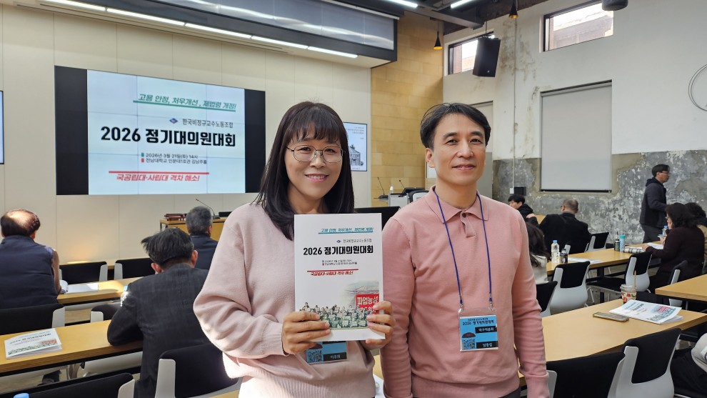(3.21.) 2026 한국비정규교수노동조합 대의원대회 페이지 정보 작성자 대구대분회 작성일26-03-23 14:51 조회44회 댓글0건 이전글 다음글 목록 본문 2026 한국비정규교수노동조합 대의원대회 댓글목록 등록된 댓글이 없습니다. 이전글 다음글 목록